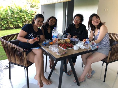 I’m grateful to Dede. I love that I never planned for Bali, yet it is the most exquisitely laid out trip – full of emotions, spirituality and meaning. I love that I could fit into a pink Batik dress meant for a five-year-old at Krishna and was allowed a beautiful lunch by the beach with the girls. A passing woman sold us beads of necklaces and anklets, of which I placed on mine and watch Dede sweetly wrap hers around her ankle.