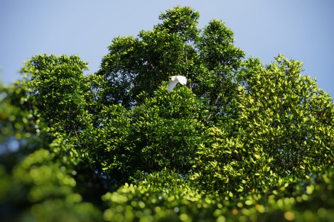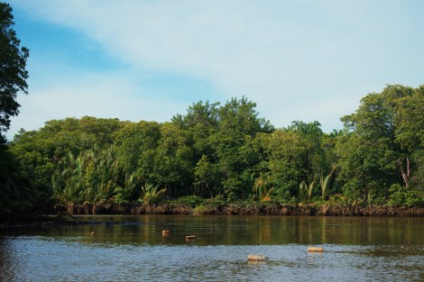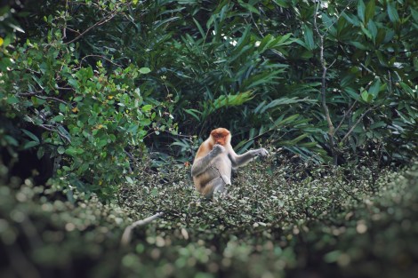 My boat journeys further down the channel where the river unravels, engulfing the banks in its entirety. Around me, the boat operators are fewer – the only company is the murky brackish water making its journey into the bay. It is a sight to be reckoned with, a stillness to be respected. We are closer to the source of mud and life now, the stink sharpening and permeating my clothes and hair, though I am no longer crinkling my nose and blowing out sharply (have I gained the boatman’s respect yet?). Before I can fully grasp the sublime wideness of the channel, Nypa Fruticans appear and flock the sides of the river. Mangrove systems, both Avicienna and Sonneratia dominate the landscape in all its glory. The system waves with the wind, a dramatic welcoming scene for the city-folks. On the emergent tree-tops, herons are poised in heraldic presence. Flying foxes camouflaged in the dark foliage keep a wary distance of visitors, while the endemic proboscis monkeys swing vine to vine, howling into the still air. I glimpse a mother – a baby! – more mothers! – and finally the long-nosed male, leader of the harem swaying in the shadows. Once again, the acoustic rumbles return – but differently here.