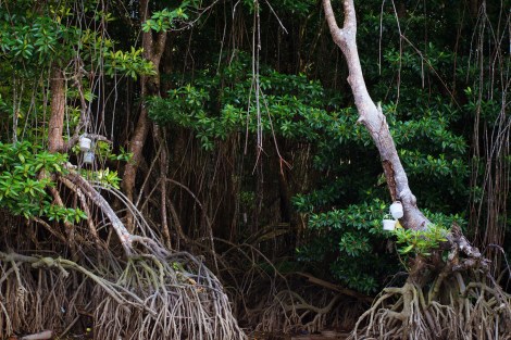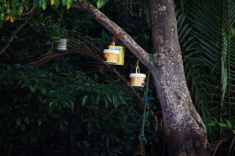 From womb to tree: For residents of the village, the mangrove system pose as an extension of their identity: along densely populated sections, paint-buckets, and biscuit containers perch precariously on branches. They store placentas of new-born babies; a spiritual ‘beacon’ for the individual to ‘return home’ when he/she dies. Animistic customs of past ancestors still manifest today, at times through subtle agencies, or in blatant displays as these. Previously suspended within cloths, these expressions of spiritual belief have adapted to the dynamic changes of external globalization forces – adoption of plastic permeates even in most private spiritual practice, is one such visible example. On less common occasions, placentas are left to drift along the river in a ritual called ‘dihanyutkan’ or sunk with stones down to the riverbed. It is undeniable that the interweaving relationship between the residents and the ecosystem are rooted deeper than material dimensions. Beyond waterscapes, residents that have migrated on-land now opt to bury the placentas in their backyard.