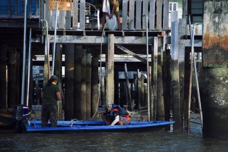 A dwindling economy: Where half of the country’s population lived on the water just a century ago, now only 3% of locals call it home – its slow deterioration a symptom of depopulation, emigration towards land as well as a steady decline in fish stocks, a former income for the local economy. Residents are strictly limited to small-scale fishing, now a scanty hobby for most. From dusk to dawn, handful of fishermen try their luck in long wooden vessels. These boats have evolved through the years to withstand the buzz and fuss of choppy surfaces. Gone are the rowing days — these boats now come to life by high-powered engines, at times even equipped with GPS. Photographed above: fishermen in a nearby boat gestures jovially towards a cool box — juvenile mangrove snappers gleam vibrantly in the sunlight. He offers one for $7.